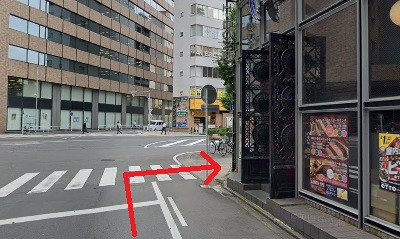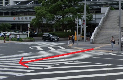 1、名古屋駅前にある大きな横断歩道を渡り、大名古屋ビルヂング方面へ進みます。